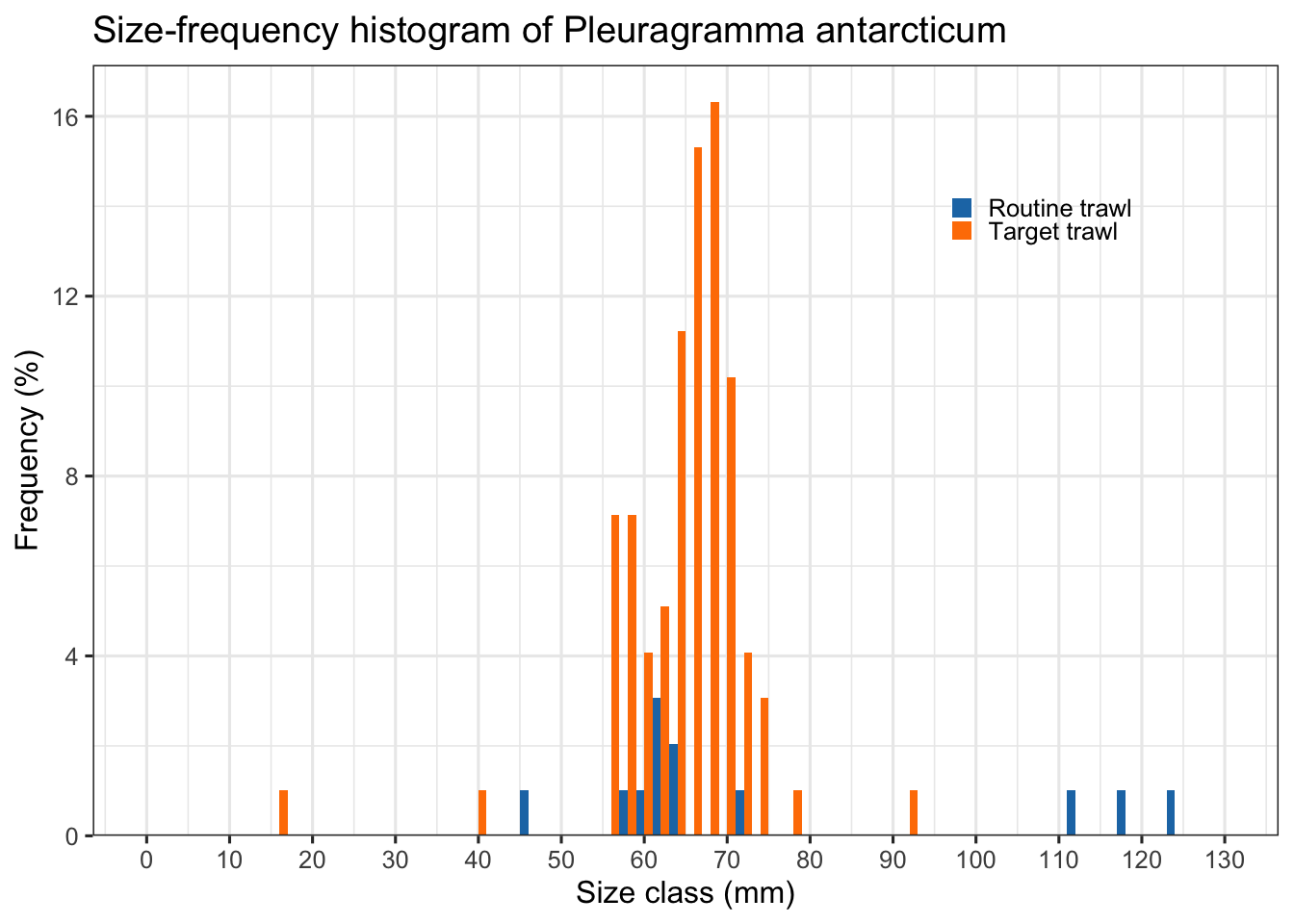 dplyr::count(df_plot, trawl_type)# Bin size = 10 mm and convert counts to relative frequency (%)